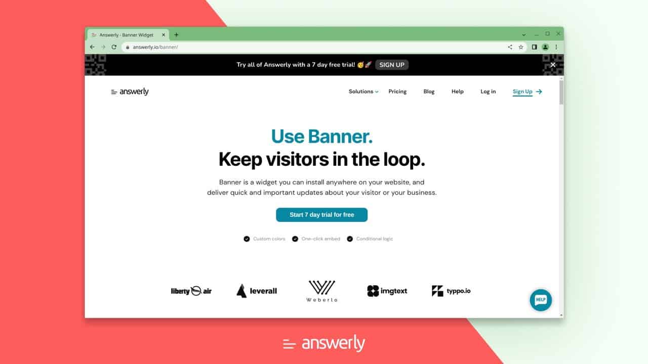 Giải pháp giúp bạn cập nhật thông tin cho khách truy cập nhanh và hiệu quả Tùy chỉnh không giới hạn, gắn thương hiệu riêng và theo dõi hiệu suất dễ dàng Answerly Banner là…