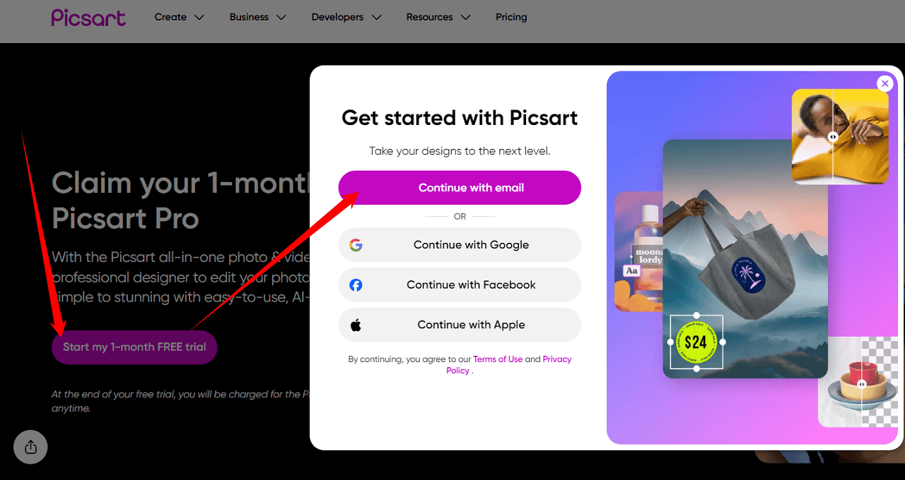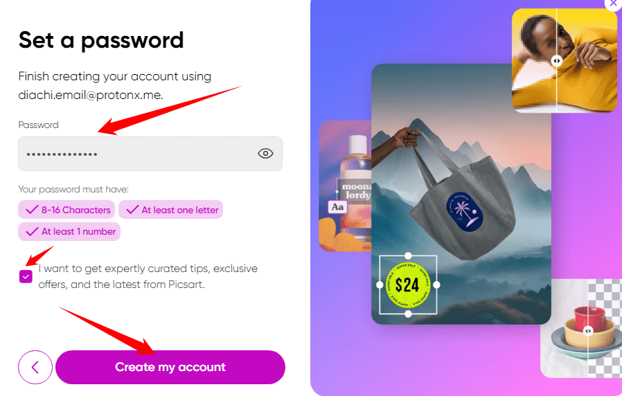 2. Tạo tài khoản Picsart mới theo email của bạn (nên sử dụng email mới để tham gia ưu đãi này).