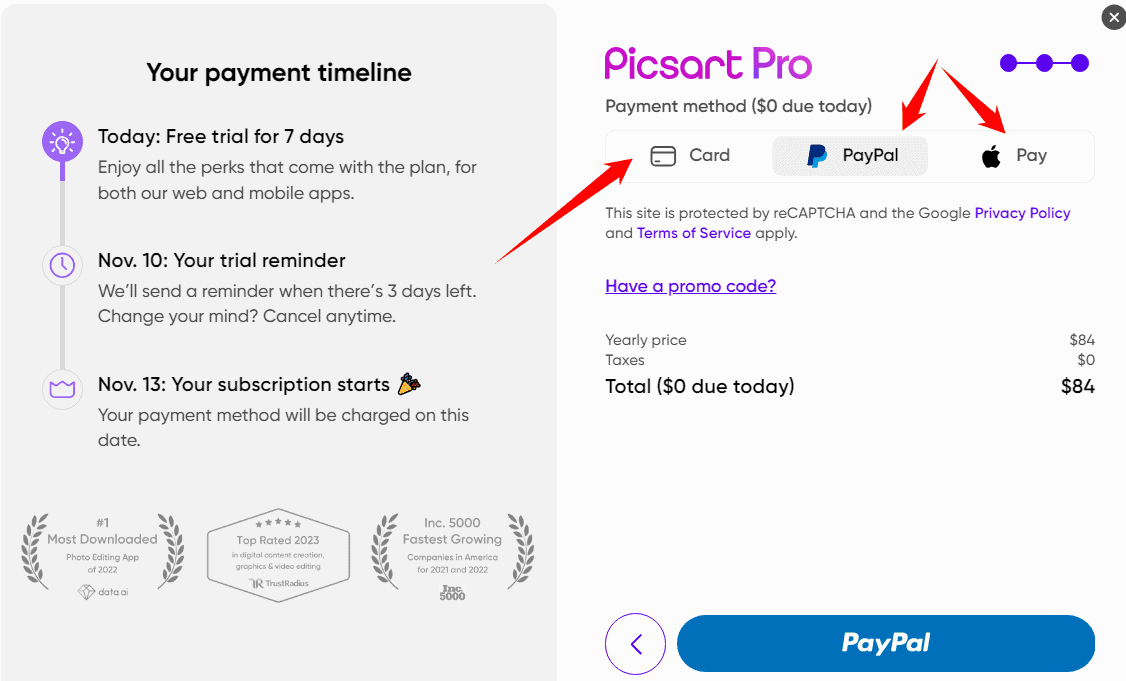 Xác thực thanh toán Picsart Pro miễn phí 1 tháng